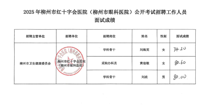 2025年度柳州市紅十字會(huì)醫(yī)院(柳州市眼科醫(yī)院)公開招聘中高級(jí)(急需緊缺)人才(第二批)面試成績(jī)公示
