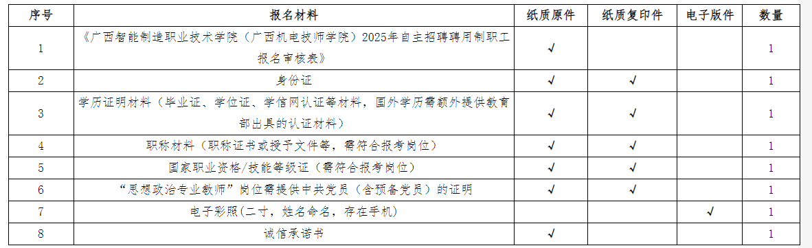應(yīng)聘者按照招聘崗位具體要求對(duì)口報(bào)名,每名應(yīng)聘者限報(bào)一個(gè)崗位,采用現(xiàn)場(chǎng)報(bào)名遞交應(yīng)聘材料的方式報(bào)名。報(bào)名人員須下載并填寫(xiě)《廣西智能制造職業(yè)技術(shù)學(xué)院(廣西機(jī)電技師學(xué)院)2025年自主招聘聘用制職工報(bào)名審核表》(附表2),同時(shí)需附上相應(yīng)的學(xué)歷、學(xué)位證書(shū)、身份證、職稱(chēng)證書(shū)(相關(guān)崗位需要)等材料的原件與復(fù)印件(原件審核后退回,復(fù)印件不退回)