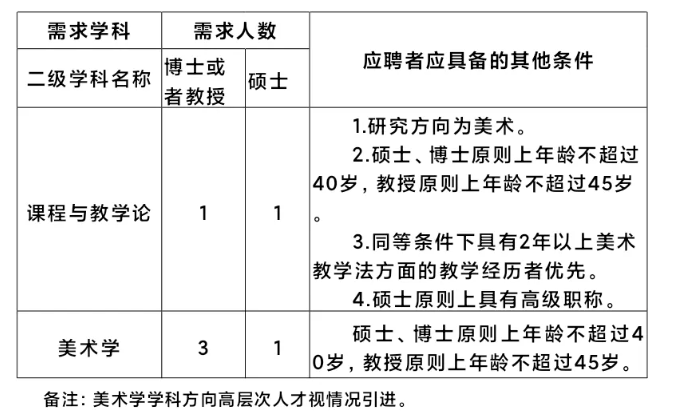 美術學院2025年計劃在美術學、課程與教學論(美術)等專業(yè)方向招聘6位專任教師,其中計劃招聘博士或者教授4人,碩士2人。
